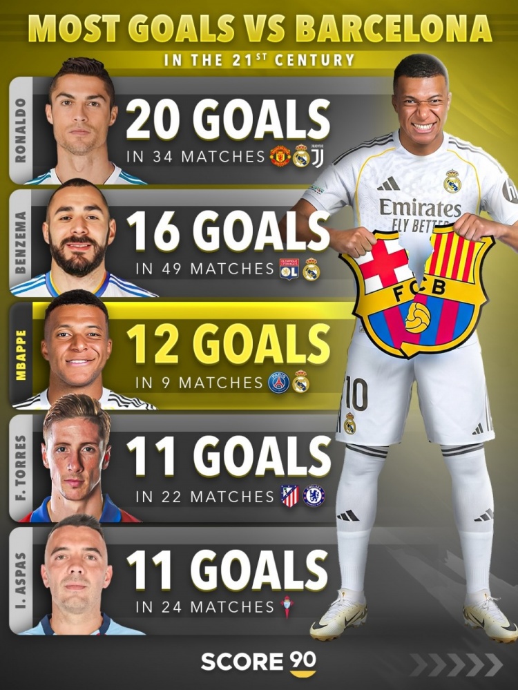 1月10日讯 北京时间1月12日凌晨,皇马将在西超杯决赛中对阵巴萨。Score90统计了本世纪球员对阵巴萨的进球数量,C罗、本泽马、姆巴佩排名前三。